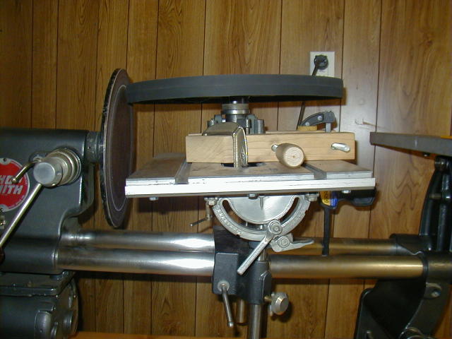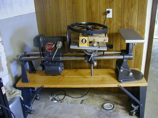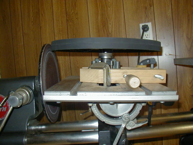 I bought an old 16" Walker Turner bandsaw on ebay. After getting the machine home I proceeded to tear it down and do a complete rebuild. It went fairly smooth, but when I got to the point where I had to machine a crown on the new bandsaw tires I was at a loss. I read Bob Vaughan's articles about building a special jig, or using a milling machine, which I didn't have access to. Then I started thinking about how I could use my Shopsmith to do this. The photos below show what I came up with.