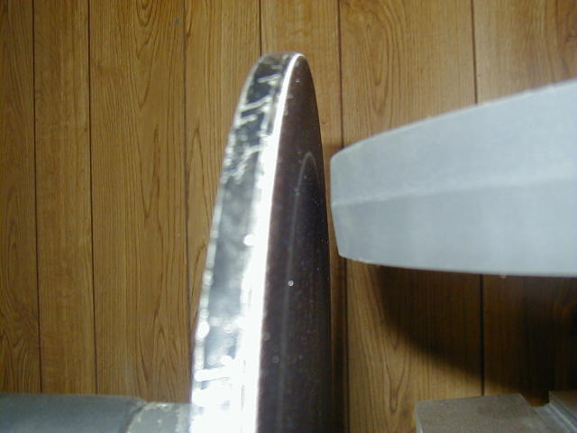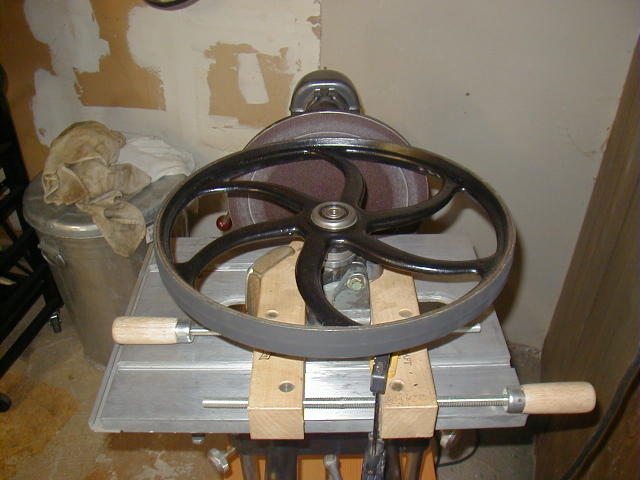 The wheel is mounted on the bandsaw's shaft assembly, which is then clamped to the SS main table. The table is tilted 5 degrees in one direction, and locked in place. The quill is advanced until the sanding disk just makes contact with the tire, and locked in place. Holding the wheel, the SS is turned on and the wheel is rotated against the rotation of the sanding disk. Continue rotating the wheel until a consistent crown is machined.