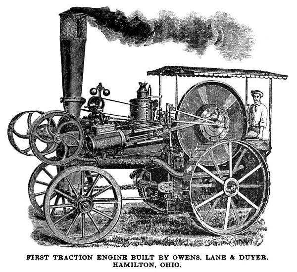 In 1873, before harvest time, John Yingling of Seven Mile, Ohio, brought a 10-horse power portable engine to Owens, Lane & Dyer Company and they converted it into a portable traction engine by the use of sprocket chains. The cylinder was mounted on the fire box end of the boiler. This engine was steered with the front wheels operated from the rear platform through a chain carried on a drum that was operated by a hand wheel through a worm and worm wheel similar to present day practice. Prior to this in a few cases they used a team of horses or oxen to steer the engine, but the engine was so fast it would run over the team. It is possible that the bevel gear drive came in after the chains. You could go up the side of a mountain and the chain would stay on, but when going down hill the chain would either fly off or break, so that the chain propulsion was abandoned and in the next type of engine built the cylinder was put at the smoke box end of the boiler. As the old original engine was a short stroke with a very long connecting rod, the crank shaft was at the fire box end of the boiler which made a very long coupled engine, and the traction power was carried to the wheels through a system of gears of the English type. It was up to this time supposed that it was necessary to have a counter shaft mounted on the smoke box end of the boiler and extending clear across so that a belt pulley would clear the boiler on one side, and the power was transmitted to this counter shaft with a V leather belt. This V belt came about as a solution of transmitting power across the street from the main machine shop of Owens, Lane & Dyer Company to a pattern shop. In order to overcome the damage from rain and sunshine, a narrow leather belt with V shape blocks built up of leather was devised and this belt was run in a grooved pulley and proved very satisfactory. This belt was made by Joseph Sharp of Cincinnati. This type of traction engine was finally abandoned and it was discovered that a belt pulley could be put on the other end of the crankshaft.