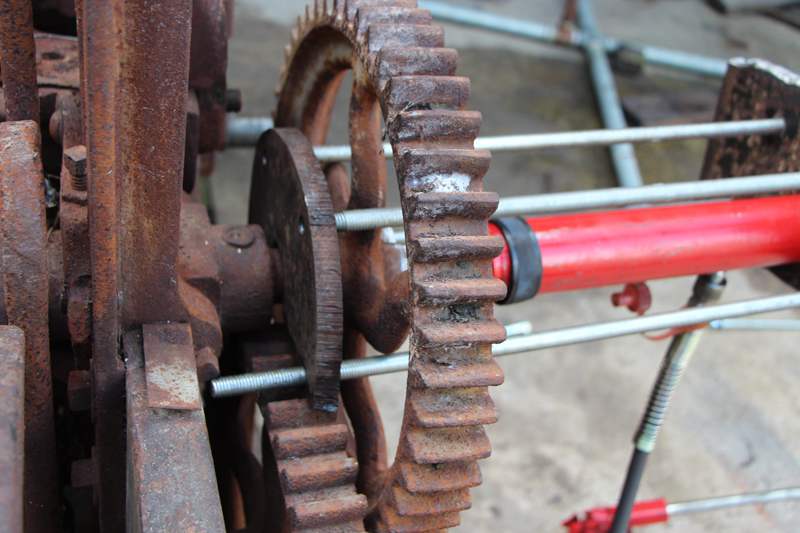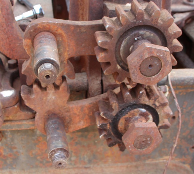 Next on the agenda was taking apart the expansion gears - two sets of them on the two sets of feed rollers. To my surprise, this turned out the be the most difficult part of all day long - while the first set came off without too much trouble, I spent nearly two hours getting the second set apart - the shafts that the gears rode on were very worn, rusted, and pitted. They were in a very hard place to get two and I could not fit a punch or hammer behind them to tap them off. I ended up putting a good bit of heat on them with the torch in hopes that I could get the cast iron to expand a bit and then used various sets of cold chisels as wedges, which I drove between the various parts to separate everything. It sounds a lot easier than it was - for a while I was really wondering if I would ever get these parts apart! Persistence paid off, and after way too long and way too many swings of a pretty big hammer (I was worn out), I was finally successful.