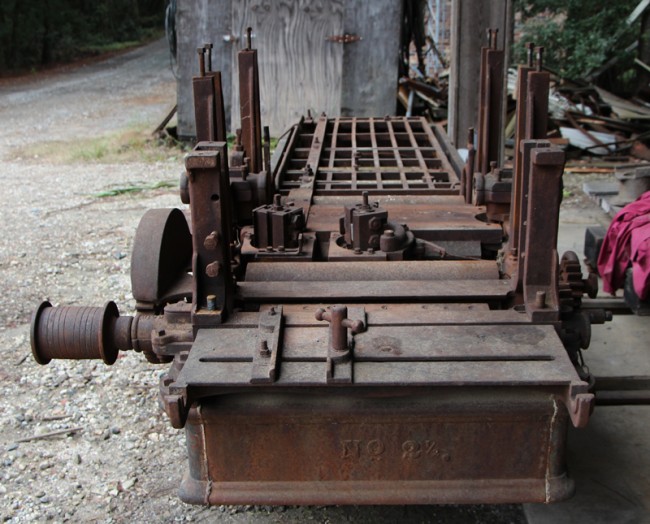 In this picture, you see the two uprights at the rear of the machine. These are located directly over the cutter-head that planes the bottom of the board going through the machine. I can only assume that there is a pressure roller that should fit into these uprights to hold the board down as the cutter-head planes the bottom of the board. All that is there are the uprights - I will have to probably imagine how this was all put together and totally re-build this from castings/steel. Also, there are two "hooks" on the very end of the machine - I can only assume that there is a roller that fits into these hooks for the boards coming out of the machine. Again, I will probably have to imagine how this was originally and turn something to work on the lathe.