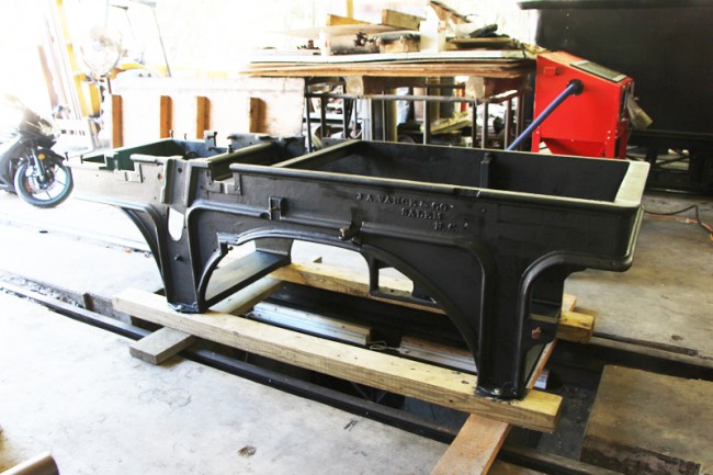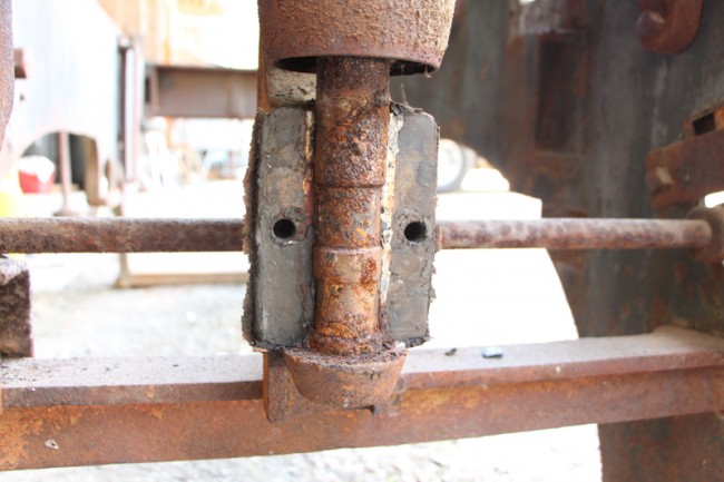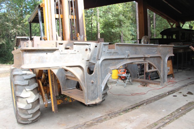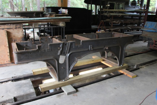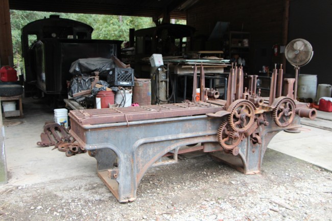 When that was done, I used some lag bolts to attach two 4x6 timbers under the feet to use as a skid. Using some old boiler tubes that were on the scrap pile, I then rolled the machine up the railroad track into the shop area and parked it right over one of the pits used to work on the bottom of the locomotives. This will give me excellent access to the bottom side of the machine for the rest of the restoration!