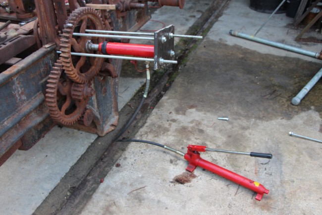 My plan was to use a hydraulic jack between the center of the shaft and the back plate - which was bolted to the puller plate on the back of the gear. I quickly ran into a problem though - I had forgotten that most hydraulic jacks do not work while lying on their side. No problem though, I remembered that the museum had a hand operated hydraulic cylinder as part of a pretty cool jacking set. I had to extend my bolts longer for the cylinder to fit using threaded rod, but it was basically the same idea as before. Here are some pictures to give you an idea of how it all worked: