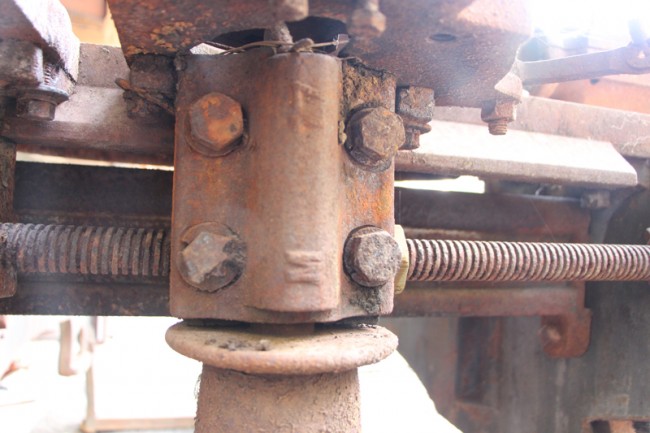 At some point in time (probably when moving it to the museum), the countershaft on the machine was bent. While not a major problem from the stand point of being able to fix it, the shaft is a pretty large diameter and a good six to seven feet long. Bottom line is that it will be expensive to replace. While I might be able to bend it back straight again, it is so rusted anyway, I will probably just replace. Coupled with the fact that one of the pulleys on this shaft is broken and will need to be replace, I doubt that I would ever be able to get the broken pulley off (along with the ones in its way that will need to be removed to replace it) with the shaft as rusty and pitted as it is. Additionally, I will need to find a replacement pulley for the one that is broken.
