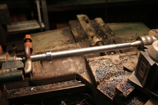 The bevel gear was then pressed onto the bottom of the elevation screws, a hole drilled through the entire piece, and a tapered reamer was used to ream a tapered hole through the gear and shaft.