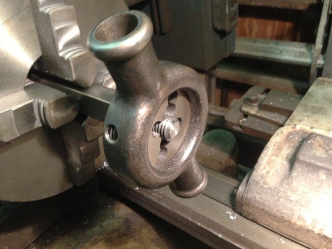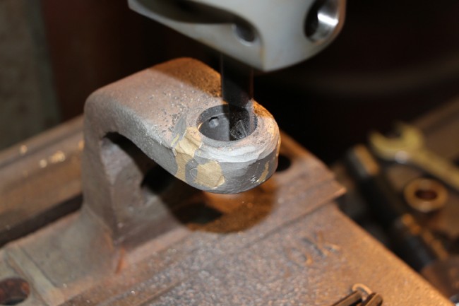 I will machine a bronze bushing on the lathe later on and press it into the enlarged hole. The bronze bushing will bring the diameter of the hole back down to the correct size as well as provide a better bearing surface for the turning rod that will fit into it. I did not have time to make the bushing, but that should be easy enough another day.