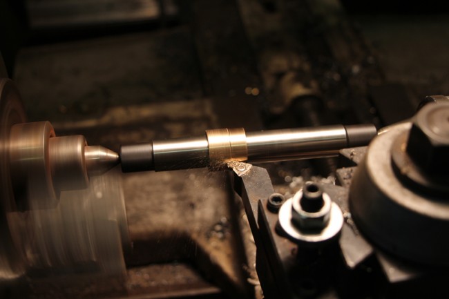 I started the evening turning down a couple of bronze bushings for the angle brackets. I had in my stash several bushings that were already bored to 3/4" internally (what they needed to be), but I needed to turn the outsides down to the proper diameter for a press fit in the bracket. To do this, I used a tapered mandrel on the lathe and turned them between centers. This tapered mandrel has a very slight taper on it so that the bushing will fit on one end but tighten up as it slides towards the other end. Once it is tight on the mandrel, you simply mount it between centers and the piece is perfectly centered. Once mounted, I turned the bushings down to the correct diameter.