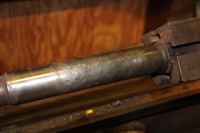 Knowing that I only had one shot at getting this job right, I turned my feed down as fine as I could go and made light cuts (about 0.005" max). In all, on the first journal, I had to remove about .080" to clean it up, but the finish was great when I got through. Here is a shot of the journal after finishing cleaning her up: