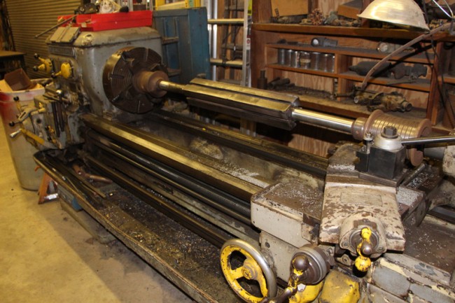 I got out to the museum early this morning and took the main cutter-head out of the spooge tank for the last time (after I got the knives off, I put back in for a while to help clean up the area under the knives which had not been worked on in the tank because they were tightly covered up). After some elbow grease cleaning up the square head, I enlisted some help from some of the college kids who were at the shop this morning getting ready for working at the museum to get the cutter-head on the lathe. It is very heavy and awkward to handle because it is so long. The plan for the day was to clean up the bearing surfaces on the cutter-head - they were somewhat pitted and worn uneven across the length of the bearing.