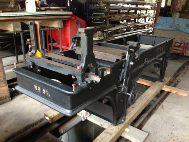 The main frame Casting is bolted together. The left and right pieces are single castings and then there are two end caps, two cross pieces between the feet, and several cross braces in the middle of the machine. The two end caps interestingly have a piece of lead sheeting sandwiched between the castings to help keep them solid!