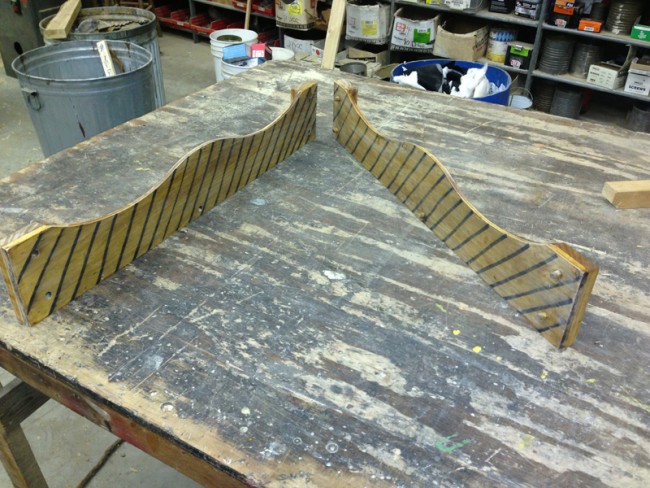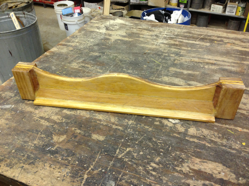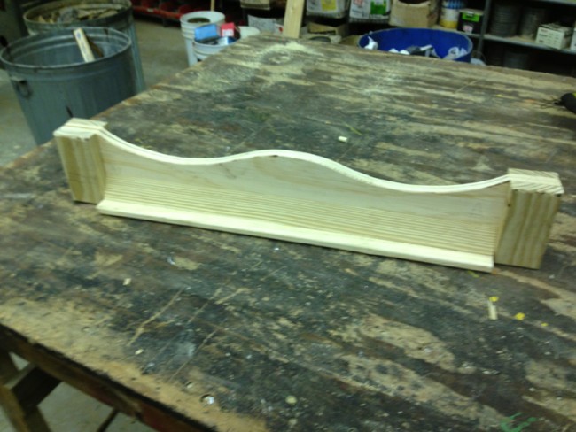 I started by milling a piece of clear pine to the proper outside dimension. I then used a stacked dado set to make a channel in the bottom of the pattern. From there, I laid out the length of the piece (using a 1/8 to a foot shrink rule to take into account the shrink factor of cast iron as it cools in the mold). The ends were cut to a radius profile using the band saw and the ends notched out again on the band saw. Here you can see where I am on this pattern as well as one of the larger cross pieces as an example: