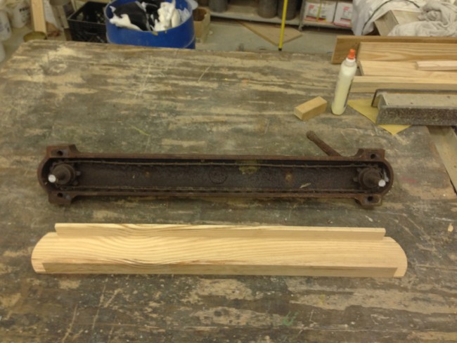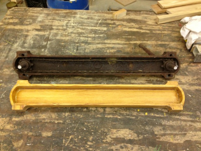 You can see the line down the center of the pattern - the pattern splits on this line into two halves - the holes in the previous picture that I showed now have wooden dowels in them to use as index pins to properly align the pattern. The molder will lay the bottom half of the pattern face down on his molding table, set a flask around the pattern, and pack the entire flask with molding sand. Once the bottom half is done, he will flip the flask over, set the top half of the pattern on the bottom half (using the index pins), put the top half of the flask in place and pack molding sand around that. The two flasks will then be separated, the pattern removed (leaving a void in the sand) and molten iron poured into the mold.