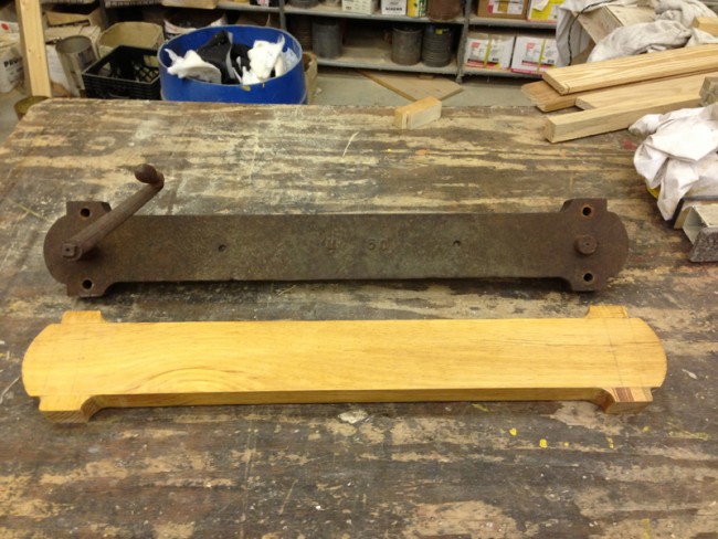With the pressure plate ready to go to the foundry, I started on the cross brace that goes on top of the uprights. Fortunately, for this pattern, I at least had something to work with off of the machine. There are two other nearly identical pieces that adjust the top feed rollers - the only difference with the one that I need is that this one is about two inces shorter than the ones for the feed rollers.