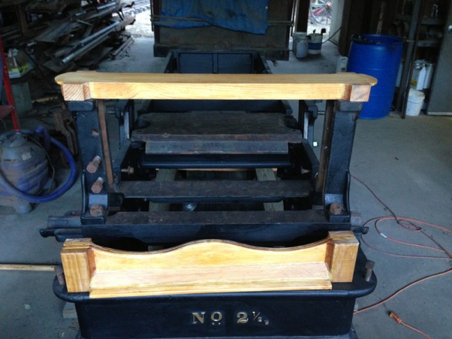 My next step on the restoration project will actually be to make a couple of patterns for two missing parts - the outfeed pressure plate and a bracket that fits across the top of two stanchions that adjust the pressure plate up and down. In order to find some measurements that I will need to make this pattern, I needed to get the stanchions mounted back on the matcher.