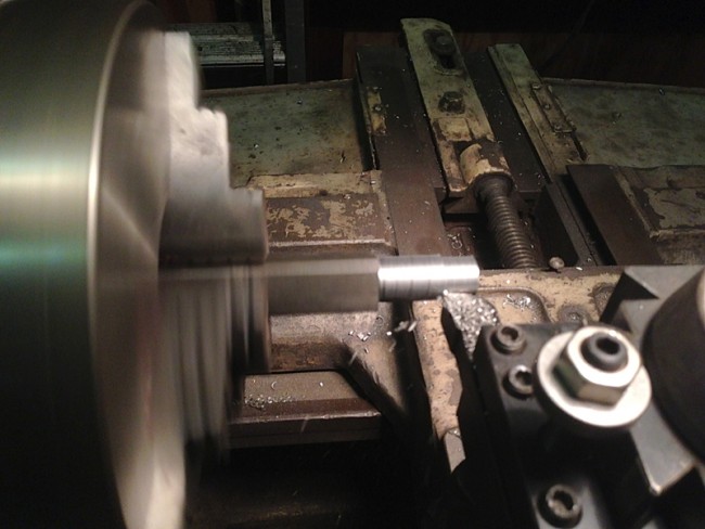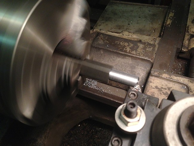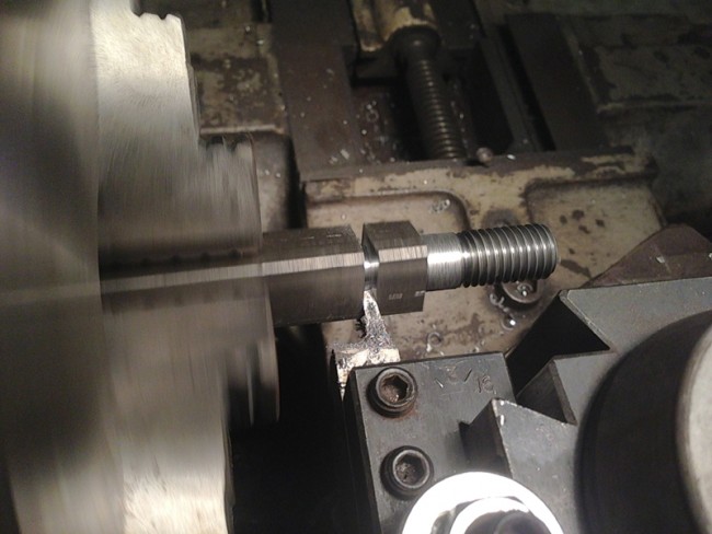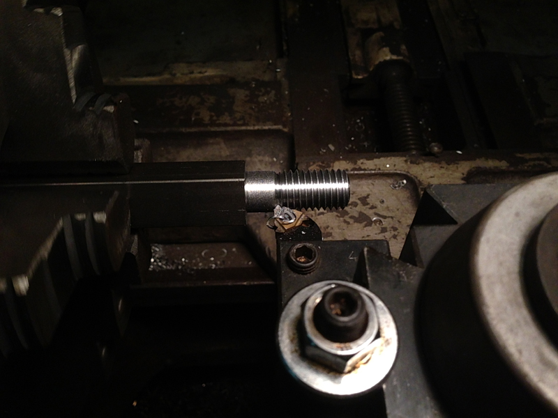 Step 3: I change tools again, this time to a threading tool. I slow the lathe speed down (flip one lever), change to feed to a slower setting (flip another lever), and then chase the threads on the lathe. I will cut them until the tops of the threads are just starting to get sharp and stop.