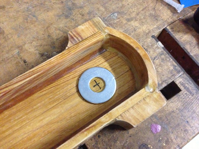 I started to turn a couple of wooden disks on the wood lathe, but I happened to think of a washer - when I grabbed on out of the bolt bin, it was just slightly larger in diameter and a near perfect match for thickness. I used 5 min epoxy to glue them in place - and while it does not show up in the picture, I filled the center in with epoxy as well so that there will not be a hole in the center of the washers when I get the cast iron parts back. A very quick and easy modification.