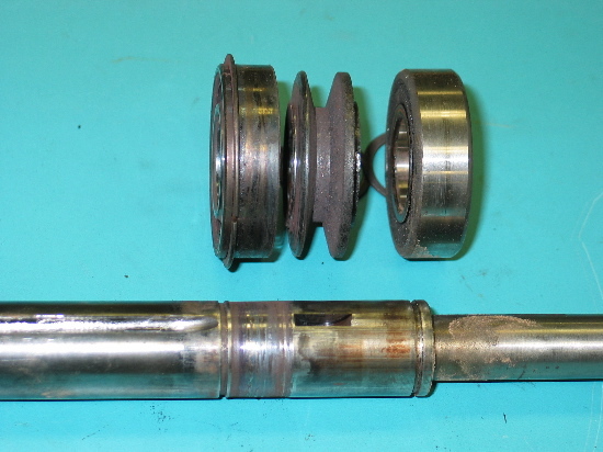 Here's the shaft with the two 6205 bearings and pulley spacer.