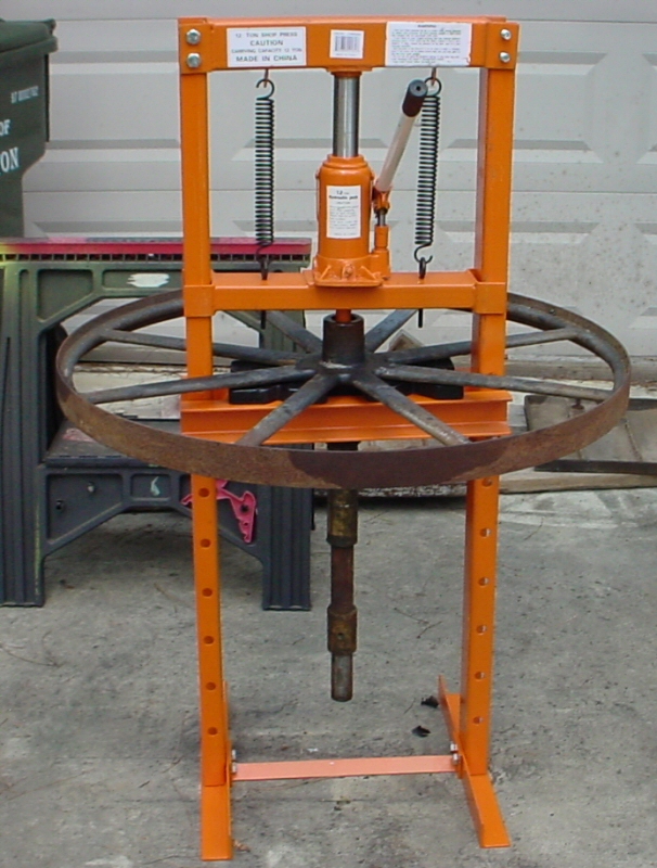 The job for today was getting the axle out of both the top and bottom wheels. I had a hydraulic press that I could use but the wheels were way to large to fit up on the table. Improvising, I took the top of the press apart and slipped the wheels on over the two uprights and then re-assembled the top of the press to do the job. While it added a little more work taking the press apart, it actually worked out just fine - just took a little while. Here is a pictures of me pressing the axle out of one of the wheels.