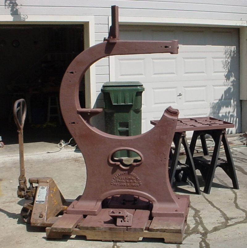 Now, fast forward to the summer of 2004. The curator of a local museum contacted me about an offer they had received for an old Alexander Dodd's Tilting Top table saw. The museum has a steam powered, line-shaft driven woodworking shop (called the Variety Works). I have been a long time cooperator on this shop, actually having written the Interpreters Handbook for the shop back in my college days and I still do quite a bit of volunteer work at the museum. When he showed me the pictures of the table saw, I immediately told him that this machine would be a great improvement over what was in the Variety works at the time - a Crescent Universal Woodworker. Now, the Universal Woodworker is a great Machine but the problem was that the machine was a later production machine and was designed to run from from below rather than from a line-shaft above. Bottom line, the Universal Woodworker was just a "historically inaccurate" machine for the shop that they had. Replacing it with the Dodd's saw would put the machines back to being period for the shop. The only problem with replacing the Universal Woodworker with the Dodd's saw was that it would mean that the display would be loosing a band saw and jointer - the other machines that were on the Universal Woodworker. I told them that I would be on the lookout for a Band Saw and Jointer and to go ahead and get the Dodd's table saw.