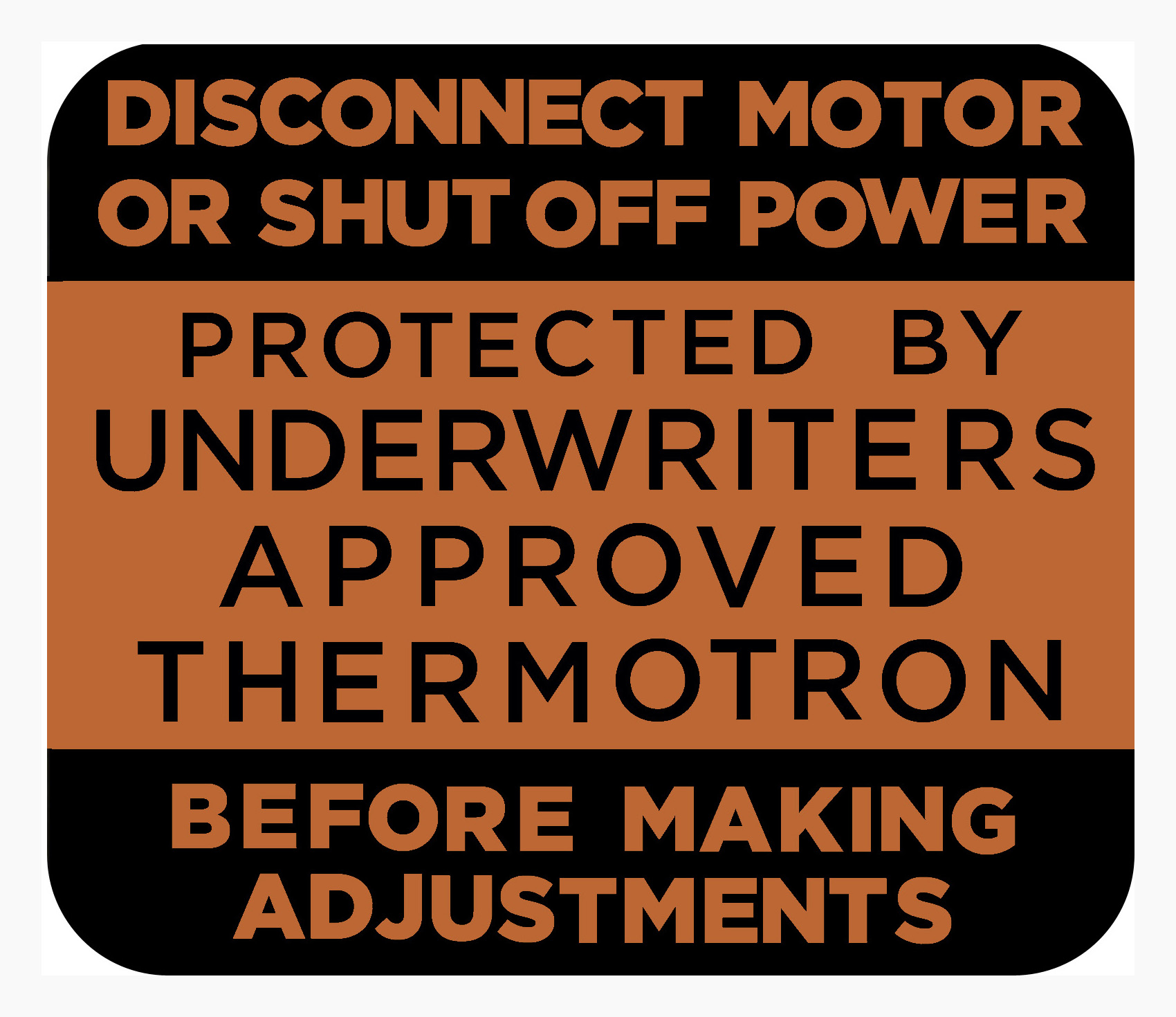 Restored image of Craftsman 115 series Thermotron-Protected Motor decal (Bottom of decal mounted 3/8" above and centered on metal data tag). Submitted by Maury Hurt (maurywhurt)