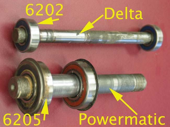 6x48 sander drum shaft sizesThought I would throw this out for illustration. I've worked on both the Delta and the Powermatic 6x48's recently and replaced both top shafts. I was amused at the differences in the way they were made and the size of the bearings used. Seeing these components side by side is instructive as to why there was a price difference in the machines when they were sold new. Both of these shafts are take-outs as are the bearings.