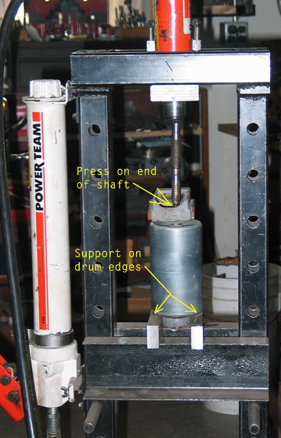 A press is recommended, if not fully required. Pounding on the shaft is unlikely to move it. The clamshell drum halves are a slip fit and should just slide off but old ones rarely, if ever, do that. The steel shaft sometimes galvanic welds to the drums, requiring significant extra pressure to break the bond. In this case it will release with a loud bang so one might want to use ear protection. The image below from Bob Vaughan shows how to set up the idler assembly in the press. Do not orient the assembly up the other way. The press should be pressing on the shaft and not the bearing. Find a length of steel smaller the shaft's 15mm diameter to press through the bearing.