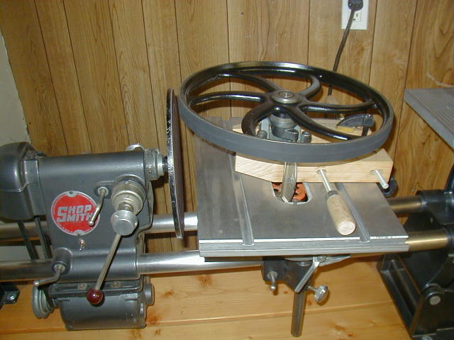 I bought an old 16" Walker Turner bandsaw on ebay. After getting the machine home I proceeded to tear it down and do a complete rebuild. It went fairly smooth, but when I got to the point where I had to machine a crown on the new bandsaw tires I was at a loss. I read Bob Vaughan's articles about building a special jig, or using a milling machine, which I didn't have access to. Then I started thinking about how I could use my Shopsmith to do this. The photos below show what I came up with.