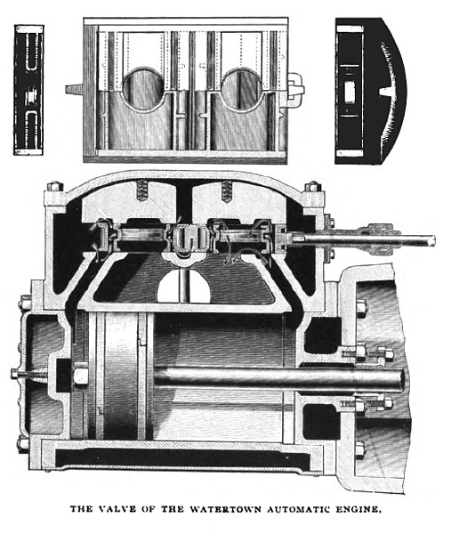 The valve, of which a sectional view is given, is also of the regular Watertown design, and has port openings so arranged as to admit steam to the cylinder ports through four different openings at once, thus giving a- port opening four times the travel of the valve and securing very prompt action upon piston. The valve also exhausts steam through four openings at once. The valve is accurately fitted to its place and is carefully scraped. On the back of the valve is a pressure plate, balancing the valve so easily, it is claimed, that it can be worked readily by one hand while under steam. This pressure plate is held in its place by a small spring at the back, holding it to its position in spite of wear and acting also as a relief valve when excessive pressure from water in the cylinder throws the valve from its seat. The valves of all four cylinders are controlled by the governor, insuring an even division of the load.