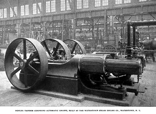 A duplex, tandem-compound condensing engine of new design is shown by the Watertown Steam Engine Company, of Watertown, N. Y. It has two nine-inch high-pressure, and two sixteen-inch low-pressure cylinders, all of fourteen-inch stroke. In the governor of this engine, unlike other shaft governors which secure a varying cutoff by shifting a single eccentric across the shaft, the movement is obtained by a mechanism which is, in effect, a double eccentric turning on the shaft. Particular attention is called to the fact that its effect is to increase the steam lead as the load on the engine is increased and as more steam is needed; on the other hand, as the load falls off, less steam is required and the steam lead is decreased, with the further result of reducing compression. The governor in this engine, it should be observed, is the same in principle and action as the regular Watertown engine governor used in the other automatic engines of the company.