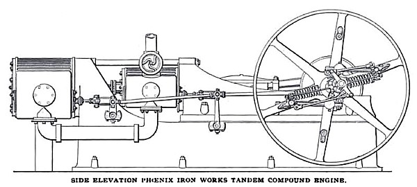 The tandem engine, of which an illustration is shown, is made from the old patterns. The cylinders are sixteen inches in diameter, high pressure, twenty-nine inches low pressure, and forty-two inches stroke, and are attached to an especially heavy girder frame. The main bearing of the shaft is 10 15/16 inches in diameter. This engine is furnished with the low-pressure cylinder next to the girder, and a very neat trunk connection between the two cylinders. The receiver on both the tandem and the cross compound engines is arranged below the floor. The third engine is a simple engine, having a cylinder eighteen inches in diameter and of forty-two inch stroke. The girder is made with a ribbed section forming three sides of a box. The governor on this engine is of the Hartnell type, well known in connection with this engine, and which has proven very successful in delicate regulation and durability. The engines are splendid specimens of design, having neat lines, and are evidently built for hard service. Their proportions are such as will adapt them successfully to electric lighting and railroad service.