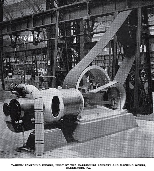 The exhibit of the Harrisburg Foundry & Machine Works, of Harrisburg, Pa., consists of two engines driving line shafting. One of these engines is the company's standard Ide pattern, automatic, tandem-compound, side-crank engine, with outboard bearing. The cylinders of this engine measure seventeen and twenty-eight inches in diameter, and have an eighteen-inch stroke. The engine is rated at 300 horse-power, when running non-condensing, and at a speed of 180 revolutions per minute. The fly-wheel pulley is 102 inches in diameter and has a thirty-one inch face. Both the high and low pressure valves are adjustable piston valves, designed by Mr. M. E. Hershey, the general manager of the company, and each is worked by a separate eccentric. The high-pressure valve is controlled by the fly-wheel governor, while the low pressure valve is made adjustable by hand to meet the varying conditions under which the engine might be called upon to work.