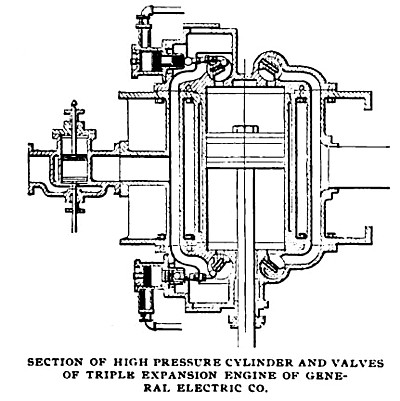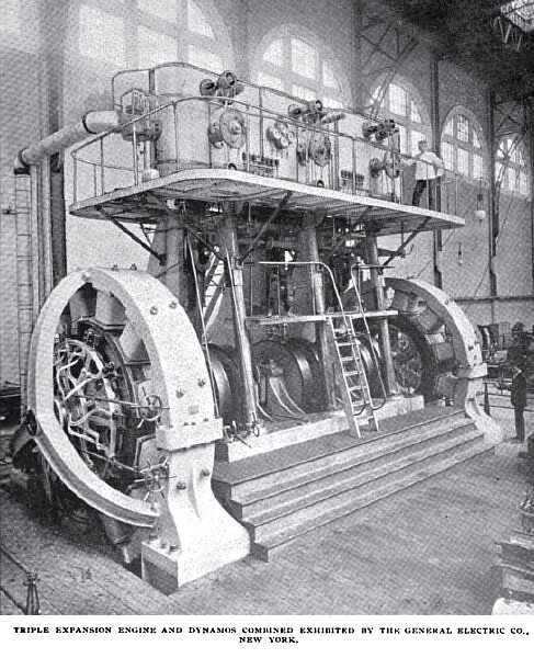 Beside the numerous steam engines belted to dynamos, there are various examples of electric generators directly connected and one of these, which attracts much attention, is exhibited by the General Electric Company of New York and Boston. The engine, which was designed under the supervision of J. C. Henderson, the engineer-in-chief of the company, is of triple expansion, direct acting, vertical condensing type, similar to others installed during the last two years by the General Electric Company, with the exception that, instead of piston valves, Corliss valves are used, which are equally, if not more, suitable, as the speed is but 100 revolutions per minute.