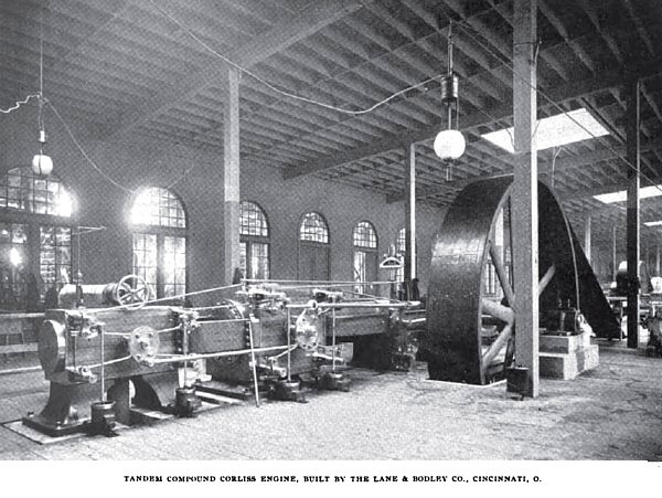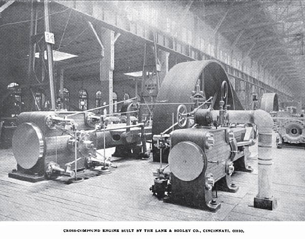 The display of the Lane & Bodley Company, of Cincinnati, O., at the Exposition consists of three horizontal Corliss engines—a simple, a tandem compound, and a cross or twin compound. The cross compound represents their latest design. The girder is of box section and with the main box and slide support is in one casting. The slides are bored to a large radius giving a very large wearing surface for the cross-head on the slides. The design is remarkable for stiffness and has been developed to meet all the requirements of electrical engineering. The cylinders are made without the usual square corners, eliminating this unnecessary finish. The bonnets and caps are made with round flanges and the legs or pedestals under the cylinder, usually detachable, are cast with it. The steam chamber in the top of the cylinder is unusually large. The engine has sixteen by thirty-one by forty-two inch cylinders, and is designed to run at seventy revolutions per minute. The main shaft is nearly eight inches in diameter. The steam pipe is five inches in diameter, and the exhaust pipe to the condenser measures ten inches. The steam ports in the high-pressure cylinders are seven-eighth inches, and the exhaust ports 1 7/16 inches wide, and both are sixteen inches long. The steam and exhaust ports of the low pressure cylinders are respectively 1 15/16 and two and a quarter inches wide and thirty inches long. The crank pins are 4 7/16 inches in diameter and five inches long.