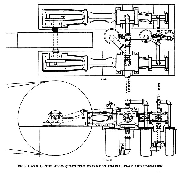 The engine transmits its power through two connecting rods directly to one crank pin. The air pump and condenser are arranged on the double-acting system, the air pump being worked by a continuation of the low-pressure piston rod.