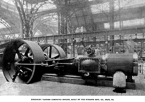The large Buckeye engine, f1rst referred to, is completely equipped with U. S. metallic packing as an exhibit of the manufacturers of this packing. It should be added also that the pistons of the large engines are made of steel for the sake of increased strength and lightness. The tandem - compound, high speed engine has been running in the temporary power plant of the Exposition during the past eighteen months.