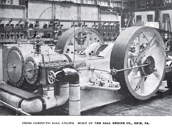 The first engines of this type were built by the Ball Company a little over two years ago for the then new electric lighting station of the Edison Electric Illuminating Company of Brooklyn, N. Y. They are specially designed for heavy work, and all the parts are made unusually large and massive. The cranks are opposite each other, one counteracting the effect of the other, so that the engines are well balanced and capable of being run quietly at high speeds.