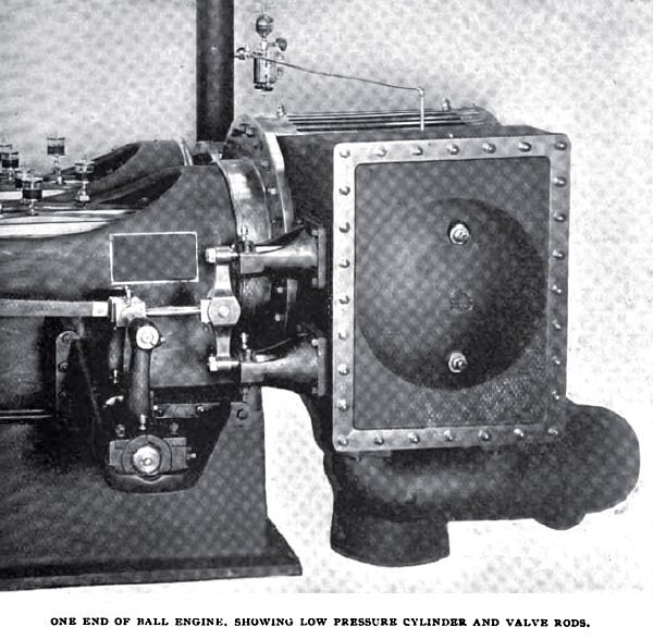 All the cylinders are neatly jacketed with closely fitting iron staves. The cylinder heads also are jacketed, and the spaces between the high and the low-pressure cylinders are covered by extensions of the high-pressure cylinder jackets. The removal of a single panel at any time gives easy access to the stuffing-boxes and cylinder heads. The whole engine, which runs in conjunction with a Knowles condenser, is mounted on a neat and substantial sub-base, with an extension on which are fitted supports for the high-pressure cylinders. These supports are so made that they can be adjusted not only horizontally, but also vertically, to meet any possible movement of the high-pressure cylinders due to expansion under heat.