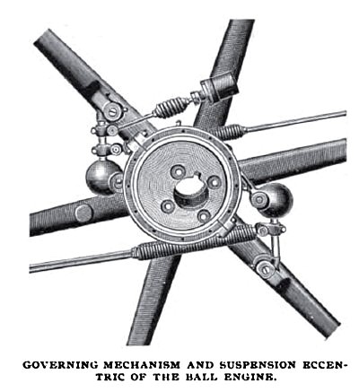 The governor of the engine, as shown, has two weights and two counteracting springs running out from the rim of the governor pulley. In addition to these there is a third spring, attached at one end to one of the weight arms and at the other to the piston rod of a dash- pot, thus providing a yielding base for this spring. The dash-pot consists simply of a cylinder filled with oil, and having a piston with an aperture through which the oil passes as the piston moves in either direction. The spring is arranged for either compression or extension. When motion of the governor weights takes place this supplemental spring is put under tension for the moment and performs the function of giving stability to the governor, but the action of the dash-pot quickly releases the tension and the spring returns to its normal condition, in which it is not a factor in the speed of the engine. The speed is determined entirely by the long springs. The illustration shows the connection of the weights by means of links to a collar. The latter is supported on an eccentric bolted to the link of the governor wheel which is keyed fast to the shaft. This constitutes a point of suspension upon which the valve driving eccentric is rotated, giving a range of cut-off from 5/8-stroke down to zero.