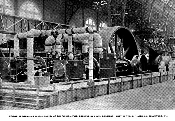 That with such extensive provisions for the exhibit of machinery the latter will form a most important feature of the Exposition seems almost needless to say, and that steam engines will be of the first prominence in this line of exhibits will be equally well appreciated. Interest will undoubtedly be centred in the large Corliss engine, one of magnificent proportions, built by the E. P. Allis Company, of Milwaukee, Wis., and suggestive at once of comparison with the famed Corliss engine used in Machinery Hall at the Philadelphia Centennial Exhibition in 1876, which was built by George H. Corliss.