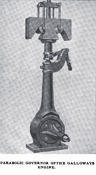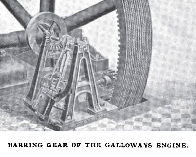 A very desirable and noteworthy feature of the engine is the safety barring gear with which it is provided and by means of which it may be turned to any convenient position for receiving steam to start it, or by which it may be turned round at any time when steam is not available. The gear is of very simple design. It consists of a horizontal shaft driven through worm gearing by the donkey engine. This shaft is provided with two helical feathers and carries a pinion rifled for sliding on these feathers. The pinion is arranged to gear into the toothed ring attached to the inner circumference of the fly-wheel. When the gear is put into operation, the pinion bears against the collar on the end of the shaft and is thus compelled to turn with the shaft, forcing the engine around. When, however, the engine receives steam and begins to turn faster than the pinion on the shaft, the pinion will instantly and automatically slide out of gear. The arrangement, as will be seen, is simple and direct, and entirely overcomes the laborious work of prying over large engines by levers. Galloways engines of the type shown have been employed successfully for such widely varying kinds of work as dynamo and rolling mill driving, and have found favor in many foreign markets.