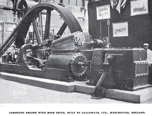 An engine which will probably appeal particularly to most visitors to the steam engine department, largely because of the rope driving gear with which it is equipped, is that shown by Messrs. Galloways, Limited, of Manchester, England. Rope-driving is essentially English in character, and was probably first used in England in 1863 by Mr. John Ramsbottom in connection with cranes at Crewe. The ropes were of cotton, and measured about 5/8-inches in diameter. They ran over pulleys with V-shaped grooves, having angles of about thirty degrees, and were supported every twelve or fourteen feet by flat pieces of chilled cast iron. Since this application rope gearing has been superseding belting and other gearing in English establishments, prominent among them cotton mills, and apparently with the most satisfactory results. In this method of driving the surface of the fly-wheel of the engine is provided with a number of parallel grooves for the ropes, the number and size of the latter depending upon the power to be transmitted.