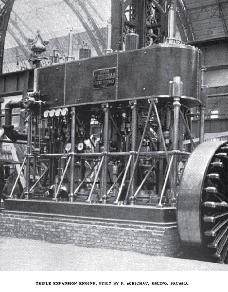 In the way of foreign engines, an interesting type is shown by F. Schichau, of Ebling, Prussia. This engine is 22¾ x 37½, x 57¼ x 27½ inches vertical, triple-expansion condensing, with three cranks, and at 100 revolutions per minute is rated at 1000 horse-power. At a speed of 180 revolutions per minute the power runs up to 2500 horsepower. Steam is to be used at a pressure of about 180 pounds per square inch. This type of engine is built specially for marine service, but the one shown is connected direct to a Siemens & Halske dynamo. The cylinders are set on steel columns, suitably braced, and the whole makes a very light engine considering the power developed, the weight not exceeding 143,000 pounds. The shaft is of Krupp steel, twelve inches in diameter, and is one solid forging. The air pump for the engine is direct connected, and is thirty-four and one-half inches in diameter by thirteen inch stroke. The condenser is formed by the exhaust pipe running toward the air pump and the injection pipe running up into the exhaust pipe and meeting the steam. The high-pressure cylinder has two eccentrics, one working the main piston valve, and the other controlling the cutoff valve which is inside the main valve and which is rotated by the action of the governor, shortening or lengthening the cut-off by opening or closing helically formed ports in the main valve. The intermediate and the low-pressure cylinders each have one eccentric connected to balanced slide valves, and the strains on the eccentric rods are reduced by small auxiliary piston attachments. The f1rst two cylinders have steam jackets supplied with steam at boiler pressure, and the jackets have small air valves to prevent air binding, and traps for draining off the water of condensation. The low-pressure cylinder is not jacketed. The piston rods are guided at both ends, extending through the upper ends of the cylinders. The crank pin boxes are of brass lined with Babbitt metal, this being true also of the main bearing, but the cross-head ends of the connecting rods are forked and the brasses are not lined. The engine is thoroughly fitted up with gauges, counters, etc., and presents a finely finished appearance.