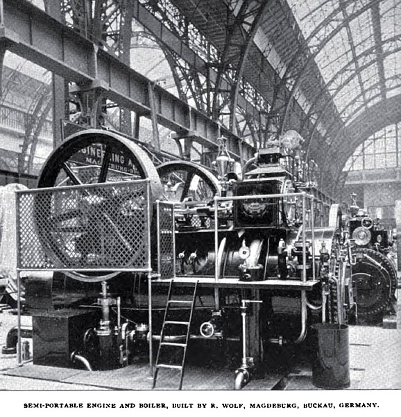 Another German engine exhibited and worthy of note is one of the semi-portable type built by R. Wolf, of Magdeburg, Buckau. This is a forty horse-power nominal, compound condensing engine, capable of indicating up to seventy-five horse-power. The cylinders are 260 and 430 millimeters (ten and one-quarter and about seventeen inches) in diameter and have a 400 millimeter (sixteen inch) stroke. The total heating surface of the boiler is 36.2 square meters, or about 390 square feet. The engine works at a speed of 110 revolutions per minute.