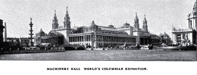 Everyone who has made a tour of the Fair buildings at Chicago, brief though it may have been, has probably found one thing worthy of emphatic condemnation, and that is, the system, or perhaps more truthfully speaking, the lack of system, of ventilation. In none of the buildings is this more uncomfortably apparent than in Machinery Hall where, from the nature of the exhibits, the heat during some of the days is trying indeed, certainly sufficient to interfere materially with the pleasure and profit of sightseeing. The vast skylight area, with the sun beating down upon it, transforms the buildings into veritable hot houses with no means of egress for the heated air nor ingress for fresh air from without. The skylights unfortunately are set on a slope with the roof, whereas, had they been set vertically, and hung on vertical pivots, with ropes handy to turn their edges to the sun, a fair degree of comfort might have been secured. As it is, the atmosphere is overheated and confined, and in Machinery Hall, at least, the discomfort is much increased by the heat radiated from the large assemblage of engines and almost endless length of steam piping. One of the queer edicts that went forth from those in authority at the Fair was that all engines and all boiler fronts should be of immaculate white, much to the well-founded disapproval and annoyance of those builders who had taken special pains to make their exhibits attractive in appearance by such means as finely-finished jackets, nickel plated trimmings and the like. White paint has, therefore, been freely used, but scarcely with wholly pleasing results. Any one, in fact, might well have foreseen what this white color craze for engine decoration would bring about. Bright and clean as the white-painted engines certainly looked when everything was new, it took but a short time for the paint to blister more or less and peel off, and for oil and grease to further disfigure it, and give the originally brilliant white a rusty, dirt-streaked aspect. Those of the engines which were left as the builders sent them—and there are a few of them—certainly shine by contrast, and present an effective and businesslike appearance.