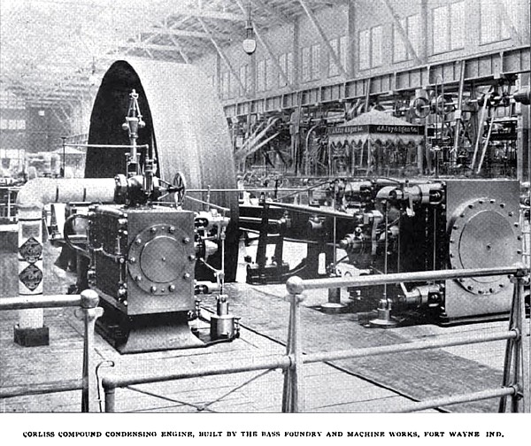 Bass Foundry and Machine Works, of Fort Wayne, Ind., consists of one of their regular cross-compound Corliss condensing engines, rated at 300 horsepower. The engine, which is driving dynamos for incandescent lighting, is worked in connection with a Wheeler surface condenser, and has sixteen and thirty inch cylinders, with a stroke of forty-two inches. The driving pulley is sixteen feet in diameter and has a forty-two inch face. The cut-off in both the high and the low-pressure cylinder is under the control of the governor. The engraving, which is given of the engine shows all its principal features quite clearly, and makes a more detailed description unnecessary.
