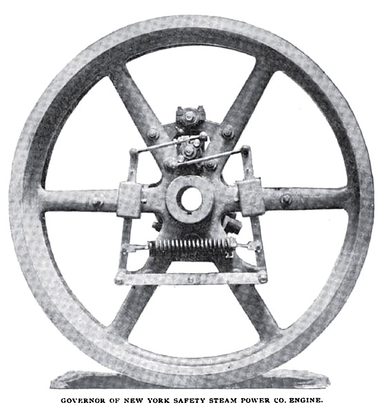 The governor is very similar to the governor used on the single cylinder engines built by the same firm, except that the eccentric, instead of being moved across the shaft, is simply rotated about it by the action of the governor weights, correspondingly changing the point of cut-off. A plate spring is used in the governor. Both sides of the engine are operated from the same governor through the intervention of a rock-shaft, which extends across and drives the cut-off valves on the further side.