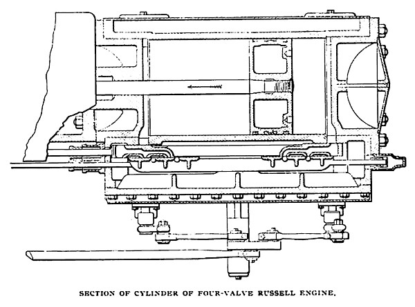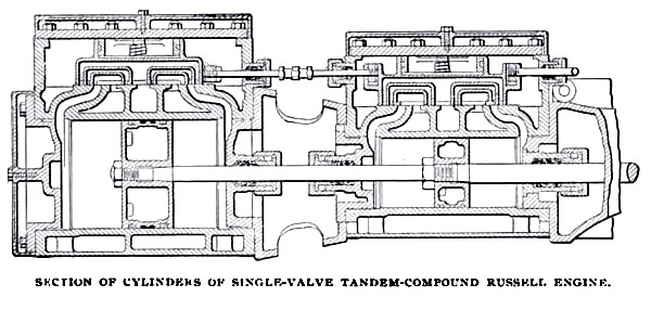 Russell & Co., is of their single valve type, with 30x20½-x20inch cylinders, and running at a speed of 180 turns per minute. This engine will develop 200 horsepower on a claimed consumption, as accounted for by the indicator, of eighteen pounds of steam per horsepower per hour when running condensing, and twenty-two pounds when running non-condensing. The main features of this engine are well shown in the sectional view of the cylinders and valve chests. In addition to this engine there are two simple, 17 x 24-inch, four-valve automatic engines, running at 150 turns per minute, and essentially the same, so far as valve details are concerned, as the four-valve, double-compound engine already described. Each of these engines will develop 200 horse-power, with claimed water consumption, as in the preceding case, of eighteen and twenty-two pounds per horsepower per hour when running condensing and non-condensing respectively.