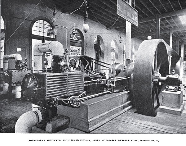 Russell & Company, of Massillon, Ohio, comprises six automatic engines. One of these is a double tandem-compound, four-valve engine, measuring 15x24x24 inches, and running at a speed of 125 revolutions per minute. It has a balance wheel measuring 120 by 60 inches, and weighing 36,000 pounds, and the total shipping weight of the two engines complete amounts to 89,172 pounds. The engines will develop 600 horsepower, with a claimed water consumption, accounted for by the indicator, of 14½ pounds per horse-power per hour running non-condensing. The admission and cutoff valves are triple-ported, balanced slide valves, balancing being effected by admitting steam between the valve faces, leaving narrow strips or bridges for the valves to ride on. Actual contact of surfaces is prevented, and the valves are really carried between layers of steam, making their movement a very easy one. The cutoff valves slide on the backs of the main valves, and are operated by a separate eccentric, which is connected to the governor so as to cut-off proportionately to the load. The extreme range of cut-off extends from 0 to ¾ stroke. The cut-off eccentric, as usual in governing arrangements of this kind, fits loosely on the engine shaft and is connected with the weight arms in such a manner that it is moved around the engine shaft, either forward or backward, as the weights change their position, thereby cutting the steam off earlier or later in the stroke as the governor, or more properly the weights, adjust themselves to the load. When the cut-off eccentric is rotated forward, that is around the shaft in the direction the engine runs, the steam is cut off earlier in the stroke; when the eccentric is rotated backward the steam is cut-off later in the stroke.