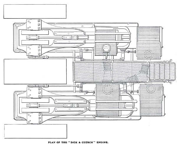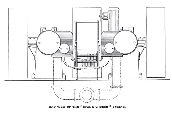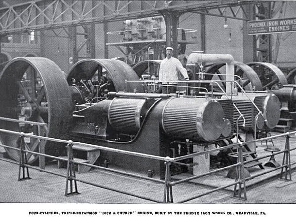 One of the most attractive and novel engines on exhibition is the "Dick & Church" four-cylinder triple-expansion engine of the double tandem, cross-compound type, built by the