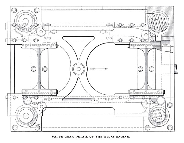 The striking feature about the high-pressure cylinders is found in the valve gear, which is of a novel and unusual kind. The rather high speed at which the engines were designed to run, of course, precluded the use of the regular Corliss, or any form of releasing valve gear. The designer was, therefore, compelled to devise a positive motion which would accomplish the same results and be unaffected by the speed. This he has succeeded in doing in a very simple and effective manner. The valves are of a form for which the builders obtained a patent several years ago. They are like the Corliss, except that, like the seats, they are provided with a number of ports. This gives them the property of the well-known gridiron valve. The valve seats are sleeves or bushings forced into bored holes in the cylinder, and are removable when worn or injured. The ports are cut in the valves and seats by an index-milling machine, so that perfect correspondence is secured. At the same time, on the outer ends of the valve and seat, the ports are marked with the cutter, which affords a convenient and accurate means of ascertaining the set of the valves when the covering bonnet is removed. The valves have stems and supporting bonnets like in the Corliss arrangement, but instead of the usual catch blocks on the valve stem cranks, the crank pins carry steel cam rollers, about 2¼ inches in diameter by 1½-inch face, on anti-friction roller bearings. Instead of the Corliss wrist plate, there is a sliding piece supported by brackets on the cylinder between the valve bonnets. The stem of the low-pressure valve is prolonged through a stuffing box at the back of the steam chest and connects by means of a drop latch with a wrist on the sliding piece. This gives the sliding piece, when the engine is running, a reciprocating motion variable in extent with the throw of the eccentric of the shaft governor. On the sliding piece is mounted a set of cams which engage the rollers of the valve cranks and operate the valves. The cams are fastened to the sliding piece by bolts passing through slotted holes, which permit their adjustment. The steam valve cams are made in two parts so placed with reference to each other as to form a groove embracing the roller on the valve crank. This groove has two level portions joined by an incline.